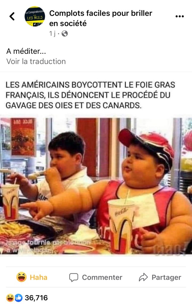J’allais vous écrire la recette des pralines de la Nouvelle-Orléans aujourd’hui. Ça devra attendre jusqu’à mercredi maintenant, car demain est consacré au Canard. Ce dernier week-end j’ai laissé un commentaire sur l’une de mes pages préférées de Facebook, Complots faciles pour briller en société. Ça a combiné deux de mes idées fixes, le foie gras (pour) et le mot états-unien (contre). Voilà le mème qui a tout lancé :