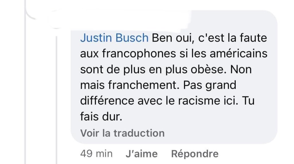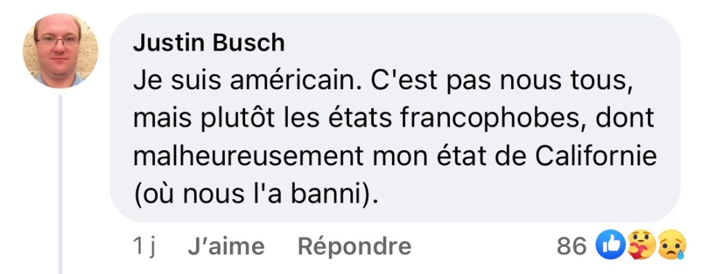 Quant à mes compatriotes, je ne sais pas. Les plus grandes plaintes sont souvent lancées par ceux qui ne font pas partie des communautés offensées. Quant aux expatriés et aux immigrants, j’en connais une qui croit que je suis bien fou, et elle ne veut plus jamais revenir en France, mais elle enseigne la langue aux anglophones. C’est pas mon affaire, juste à dire que je doute que ces plaintes viennent de la communauté francophone ici.