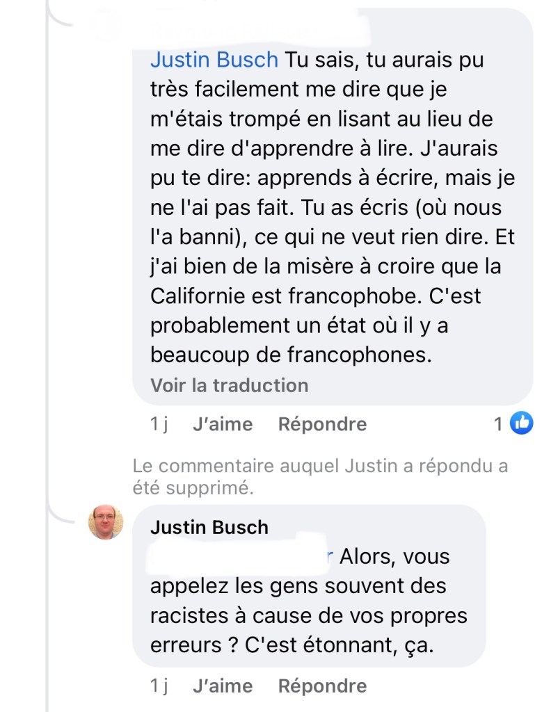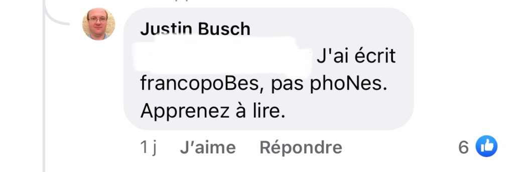 Mais pire, j’ai mis le feu partout. Il ne faut absolument pas être étranger et dire « apprenez à lire » aux autochtones. C’est pire qu’avoir dit « Le cheddar est mieux que le Comté » ou « J’adore le champagne californien ». Surtout après une faute de conjugaison, puis une d’orthographe ! Après cet échange, le déluge.