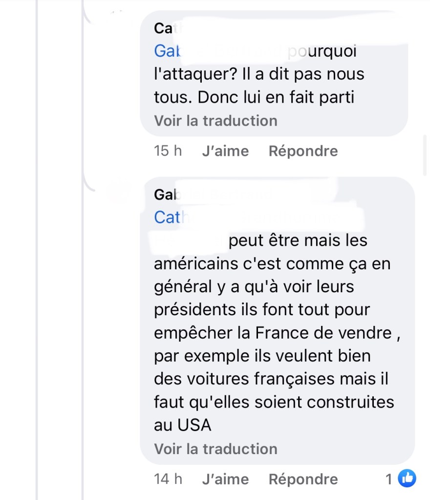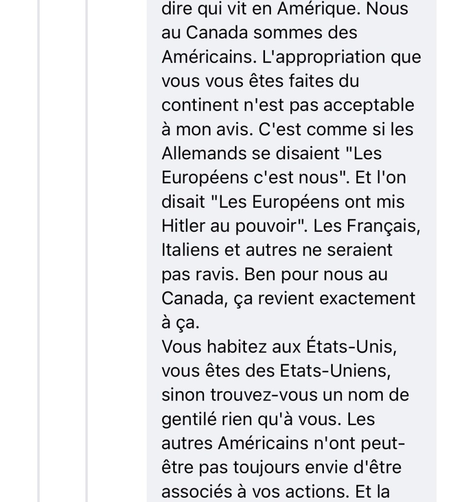 Et il y avait ceux qui avaient des haches à moudre, comme on dirait en anglais (pensez à « compte à régler »). Voilà une canadienne qui a gentiment suivi un français qui s’était plaint du mot « américain ».