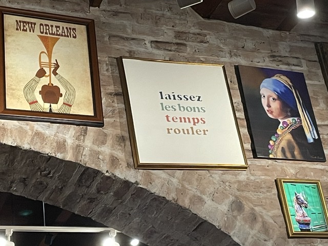 Beaucoup de restos sont fermés le mardi, alors on a dîné chez Café Maspero, un resto plutôt touristique. Notez bien le slogan de la Nouvelle-Orléans sur un mur, « Laissez les bons temps rouler ».
