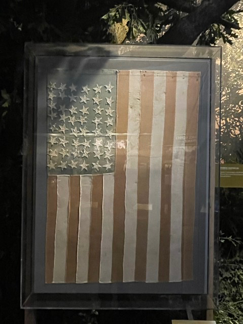 Et voici un drapeau américain fait par des Français pour fêter la libération. Il n’y a que 48 étoiles car l’Alaska et Hawaï n’étaient pas toujours des états à l’époque.
