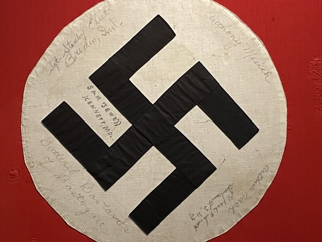 Je suis toujours corniaud pour un drapeau nazi capturé. Celui-ci est signé par les soldats qui l’ont capturé; j’ai pris une photo très proche pour que vous puissiez voir les signatures.