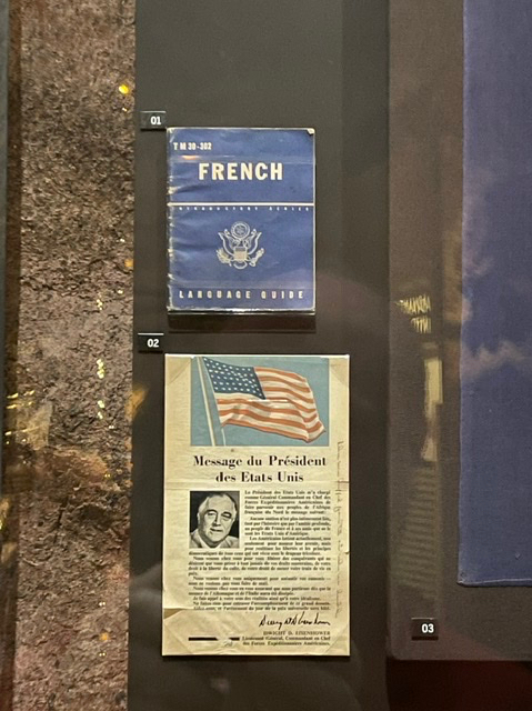 Je veux attirer votre attention à deux objets à gauche. Le livret bleu est un guide à la langue française, duquel j’ai écrit l’année dernière. Au-dessus, il y a un message du général Eisenhower en français, publié à l’époque dans les journaux.
