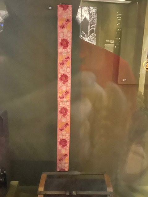 Voici une ceinture de soie présentée par des bretons au lieutenant Cecil Ellzey le 25 septembre 1944. Selon la plaque, à l’envers est écrite « Vive La Grande Libération » :