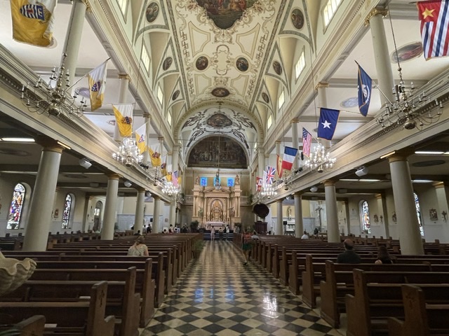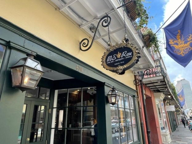 On commence à l’extérieur, leur porte sur la Rue Royale (votre carte dira Royal Street, mais les panneaux sont bilingues). M.S. Rau existe depuis 1912, mais ce n’est pas du tout leur site original ; ils ont bien grandi. La Rue Royale est la maison de nombreux tels magasins, mais rien ne vaut la comparaison.