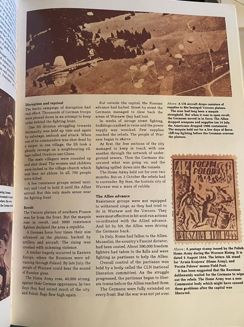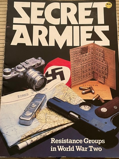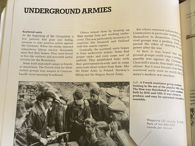 Mais cette fois-ci, j’ai trouvé quelque chose de complètement inattendu, mon trésor le plus précieux en tant qu’enfant. C’est un livre intitulé « Secret Armies » (Armées secrètes), et il s’adresse aux enfants d’environ 10 ans. Il s’agit d’une histoire des partisans dans les pays occupés, surtout lequel ? La Norvège ? Qui lisez-vous en ce moment ? On parle de la France ! Ça fait un beau 25 ans depuis la dernière fois où j’ai vu ce livre, et je le croyais perdu.