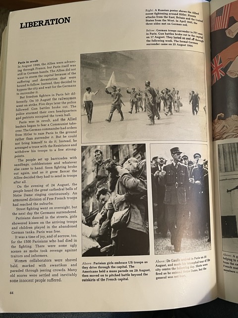 Le livre finit avec la libération de la France. Des autres pays sont mentionnés, mais c’est la libération de Paris qui gagne la grande majorité de l’espace. (Toujours Paris avec ces gens !) On voit les Forces françaises de l’intérieur, l’arrivée du général de Gaulle, et de la propagande soviétique, qui ne donne pas de crédit aux FFI.