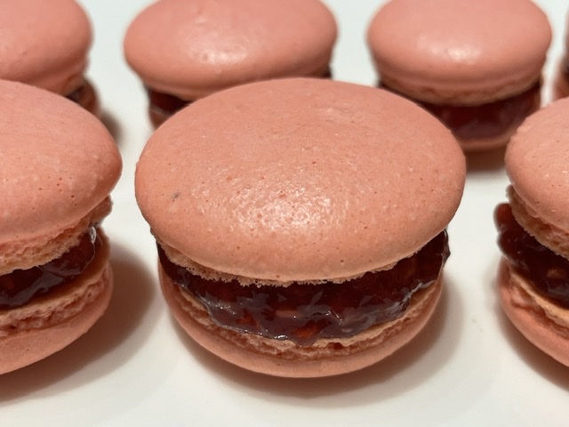 Les macarons à la framboise sont l l’un de mes plus vieux outils. On peut les voir en haut à droite du blog depuis le début. C’est une recette de Laurène Lefèvre, qui vient de cette vidéo. (Le texte est tout à moi.) J’ai fait des centaines de lots de macarons pour les maîtriser (voici deuxexemples), et je n’exagère même pas un peu — ça fait 4 mois depuis mon dernier lot, et vous pourrez voir la différence entre les deux lots en bas. C’est la pâtisserie la plus française au monde — il n’y a pas trop d’ingrédients, mais réussir demande de la technique, de la technique, et encore plus de la technique.