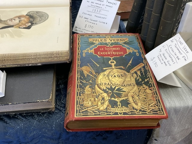 Il y avait un monsieur qui vendait des livres « rares et vieux », et je pensais tout à coup à certaines d’entre vous. J’ai presque — presque ! — acheté un guide à Paris des années 1920s. Il était en anglais, mais la vraie raison pour laquelle j’ai changé d’avis, c’était que l’on traite toute la France également ici. Bon, je mens — si certaines choses arriveront, mon dîner seinomarin sera spécial. Mais laissez tomber jusqu’en été prochain. Ce livre de Jules Verne m’a attiré, mais pas à 180 $.