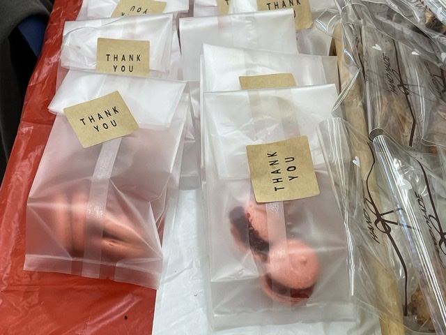 Hélas, les macarons en haut de la boîte où je les ai rangés ont eu un voyage un peu difficile. Alors, ce ne sont pas mes plus beaux. Au fait, j’ai une question que je ne voulais pas du tout demander au marché. Tous les sacs de pâtisseries fait maison ont été vendus pour 1 $. Il y a deux de mes macarons, d’accord ? J’ai acheté quelques autres, et…pourquoi valent les miens la moitié de ces autres macarons ?