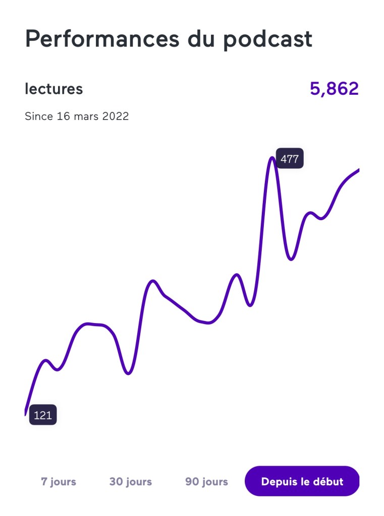 Il me surprend toujours que je suis devenu baladodiffuseur, comme le dit nos amis québécois. Je croyais qu’il serait chanceux de durer 10 semaines : il y a maintenant plutôt 41 épisodes sans rater une semaine, même en voyageant, j’en suis fier ! Le graphique en bas mesure toutes les deux semaines, mais ce qui compte, ça pointe dans la bonne direction. Demain, des nouvelles sur ce sujet.