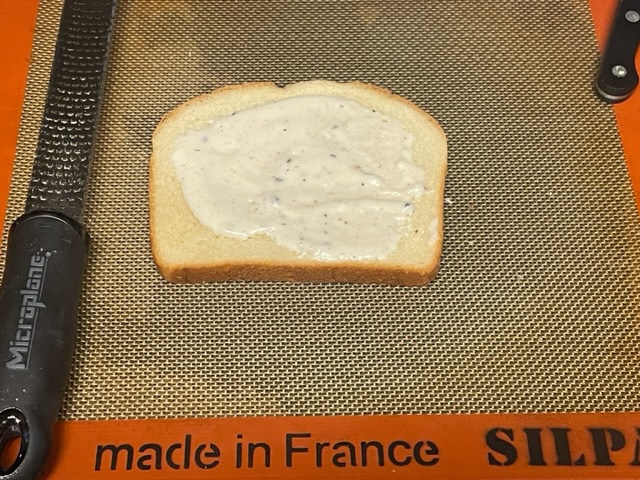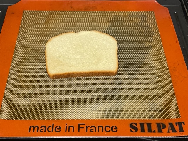 - Mettre un tapis en silicone sur une plaque de cuisson. Y déposer des tranches de pain de mie (1-4 selon vos besoins).