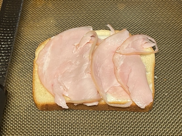 - Déposer des tranches de jambon au-dessus du pain.