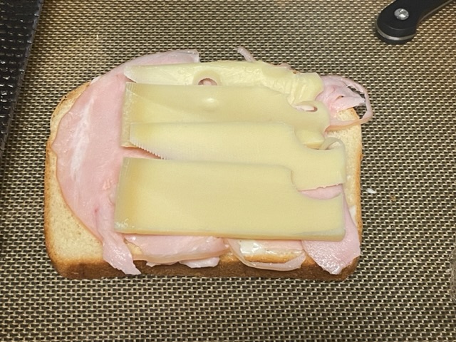- Déposer des tranches de fromage Emmental au-dessus du jambon.