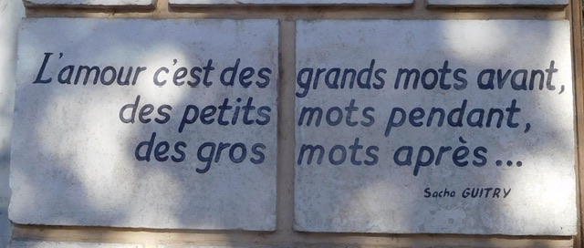 Juste au nord de Nevers, on trouve La Charité-sur-Loire, et surtout son Église prieurale Notre-Dame (2 étoiles). La prieuré était anciennement l’un des monastères les plus riches de la France, et on le voit toujours dans ses 5 nefs et capacité d’accueillir 5 000 personnes malgré son origine du XIIe siècle. De nos jours, elle abrite la Cité du Mot — attention, les blogueurs littéraires ! — membre de l’Association de Centres culturels de rencontre, qui abrite de son tour un festival annuel, Aux Quatre Coins du Mot, consacré aux livres, avec des lectures, des concerts, et de nombreuses autres activités. Partout dans la ville, on trouvera des citations sur les murs, comme en bas.