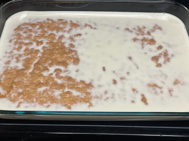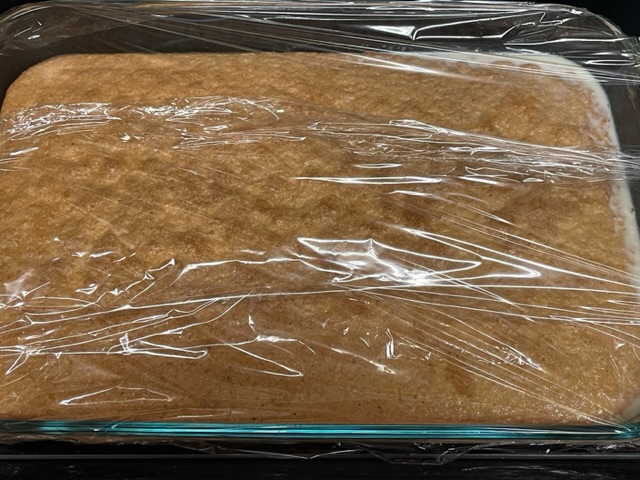 1. Verser la moitié du mélange de laits sur le gâteau. Attendre quelques minutes pour que le lait soit absorbé, puis répéter avec le reste.
