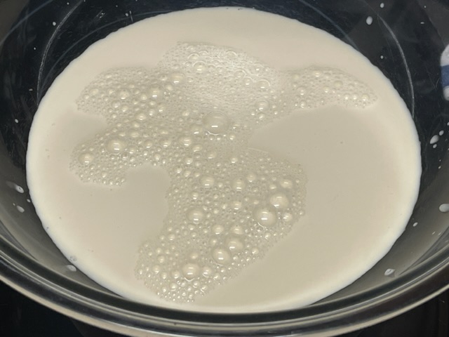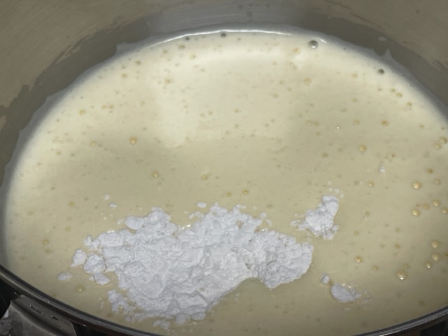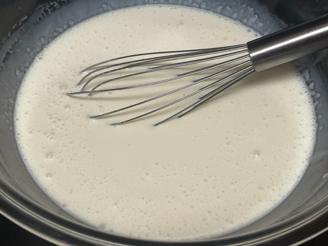 2. Pendant que le gâteau refroidit, dans un grand saladier mélanger les deux laits concentrés et 250 ml de crème liquide entière. Fouetter vigoureusement pour tout combiner.