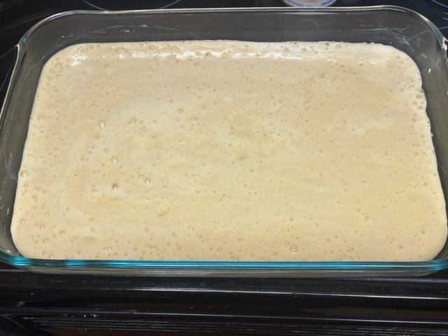 1. Verser la pâte dans le plat creux. Étaler avec une spatule ou une maryse si besoin. Faire cuire 30 minutes, jusqu’à ce que le gâteau soit doré et rebondisse si touché au centre.
