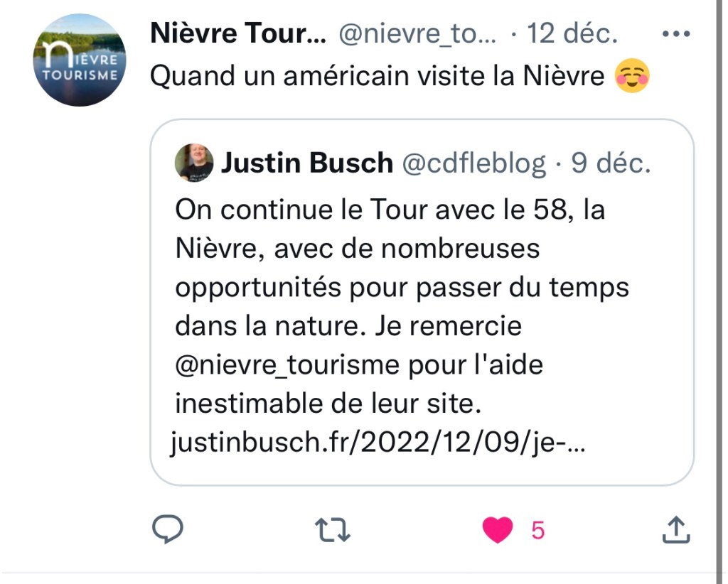 Je ne vous dis rien que vous ne le sachiez déjà. Mais quand j’ai vu mon propre nom en vedette comme ça, c’était plus que surprenant. « Justin BUSCH aime la Nièvre » — et alors ? Ça vaut un gros titre ? Je suis juste un internaute ! D’autre part, si vous cherchez dans mon Guide Vert en anglais, seulement Nevers y apparaît, en tant que suggestion d’escale près de Beaune. Ça fait chaud au cœur d’être apprécié, et c’est clairement le cas dans les deux sens.