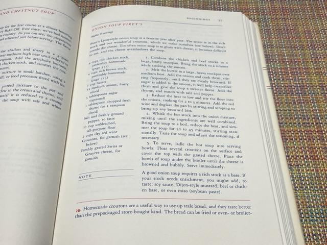 Un peu plus tard, on trouve leur recette de soupe à l’oignon. C’est à base de deux bouillons — moitié poulet, moitié bœuf. Je trouve ça inhabituel, mais ils disent que c’est selon la façon lyonnaise. J’ai mes doutes — beaucoup de recettes dites « lyonnaise » (voilà, voilà, voilà et voilà) utilisent soit juste de l’eau soit du bouillon de poule. En revanche, Jacques Pépin, Légionnaire d’Honneur, enseignait souvent chez les Munger, et il travaillait à Lyon au début de sa carrière. Je suis prêt à croire que c’est ça l’origine « lyonnaise ». N’oubliez pas, pour épater les clients américains, il suffit de mentionner un nom français. Vous sous-estimez votre prestige ici.