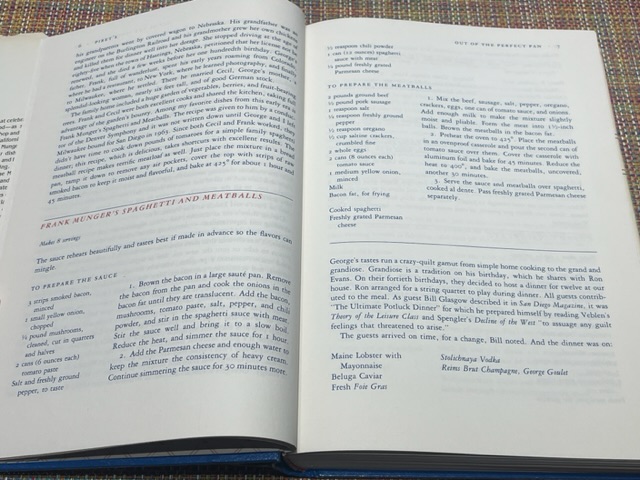 La toute première recette du livre est « spaghetti and meatballs » (des spaghettis aux boulettes de viande), une version fortement américaine. C’est un hommage aux origines de George Munger dans le Wisconsin, avec du piment en poudre et des biscuits dits « Saltines » :