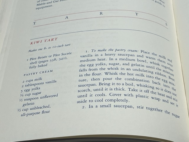 Malgré le fait que j’ai des souvenirs forts de mille-feuilles chez Piret’s, il y a très peu de desserts rigoureusement français dans ce livre. Voici leur sélection de tartes : au kiwi, aux pommes, rustique aux pommes, à la crème de citron, et à la ricotta et aux amandes. Il serait plus correct de dire que toutes sont élaborées avec des techniques françaises, mais qu’elles ne ressemblent pas trop aux tartes de Gaston Lenôtre.