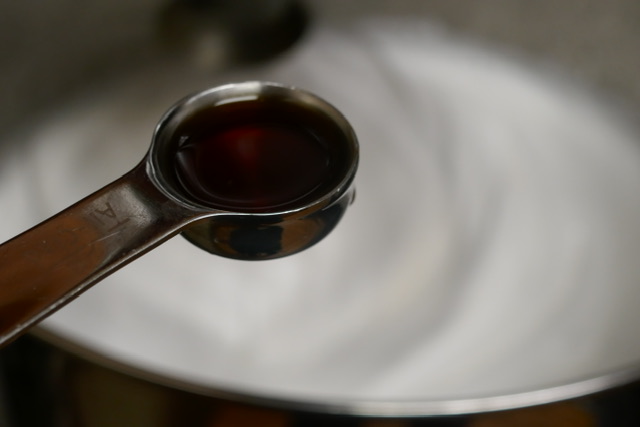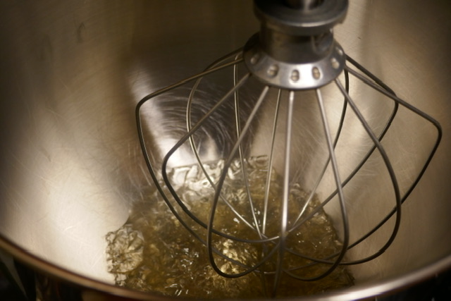 1. Commencer à fouetter la gélatine à petite vitesse. Verser le mélange chaud doucement dans le bol. Vous voyez à quel point je vous aime pour prendre cette deuxième photo, le liquid chaud dans une main, l’appareil photo dans l’autre ? Une fois tout le mélange est dans le bol, hausser la vitesse et fouetter à haute vitesse pendant 12-15 minutes. Ajouter la vanille liquide 1 minute avant la fin. Pendant ce temps, préparer un plat selon la prochaine étape.