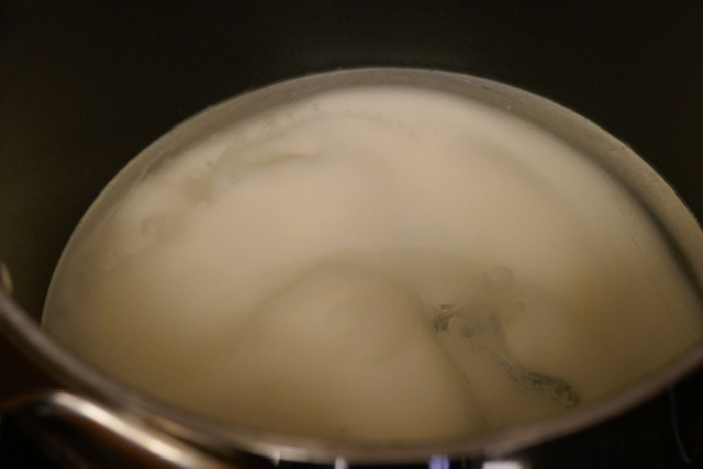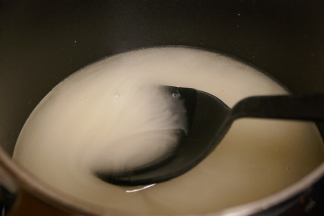 2. Dans une casserole, mettre l’autre 120 ml d’eau, le sucre en poudre, le sirop de glucose, et le gros sel. Couvrir et faire cuire sur un feu moyen-vif pendant 3 minutes. Puis retirer le couvercle et continuer de faire cuire jusqu’à ce qu’une température de 114°C (utilisez un thermomètre) soit atteint. Une fois réussi, retirer la casserole du feu immédiatement.