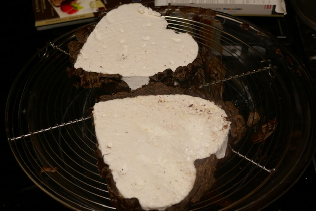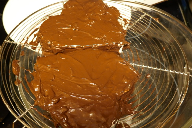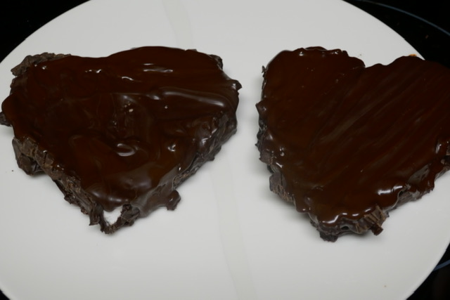 1. Verser du chocolat au-dessus des cœurs. Étaler avec une maryse. Puis, je les ai laissés reposer au frigo pendant 20 minutes. C’était trop long pour 2 raisons : 1) le chocolat a perdu son lustre, et 2) le chocolat a bien collé à la grille. J’ai dû le retirer avec un couteau et abîmé un peu mes cœurs. 7-8 minutes suffira. Les 3 dernières photos montrent un cœur après avoir été retiré de la grille.