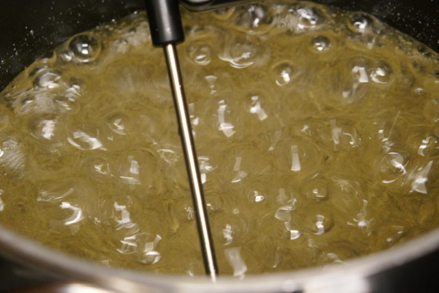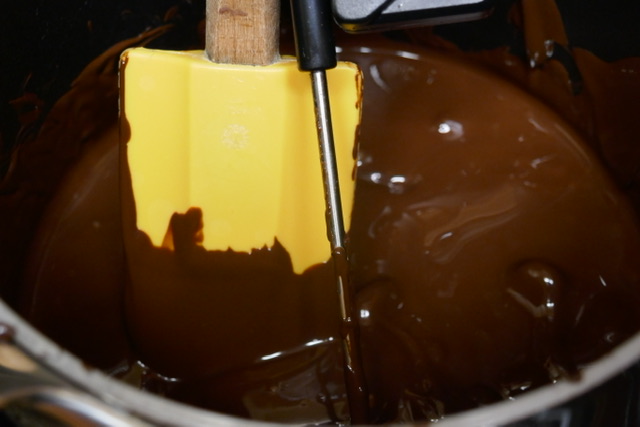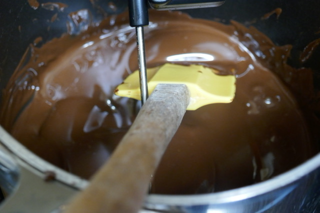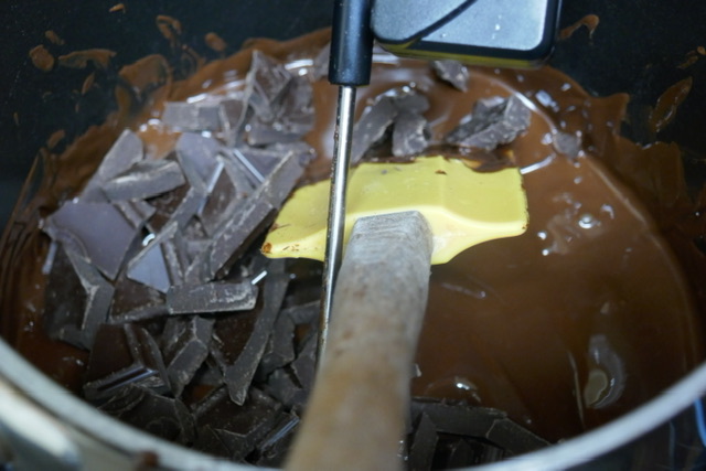 2. Faire tempérer le chocolat : Avec 350 grammes de chocolat, j’avais assez pour 2 des gros cœurs. Je recouvrirai le reste plus tard, et je crois que 350 grammes de plus suffira. Mettre 2/3 du chocolat dans une casserole sur un feu très doux, juste allumé vraiment. Faire fondre jusqu’à 43°C. Retirer du feu, remuer jusqu’à 37.8°C, puis ajouter le reste du chocolat. Remuer jusqu’à ce que le tout soit fondu.