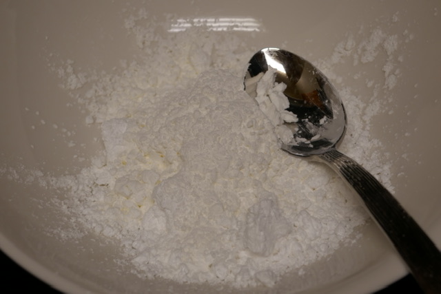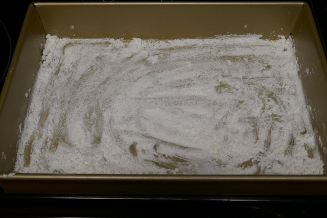 1. Graisser légèrement un plat creux en métal de 33×22 cm avec de l’huile végétale. (J’ai utilisé l’aérosol de cuisson dans la première photo, mais une amie me dit qu’il n’existe pas en France. C’est plus ou moins du colza.) Dans un petit bol, mélanger le sucre glace et la maïzena. Couvrir le fond du plat avec un peu du mélange de poudres, secouer, et garder le reste.