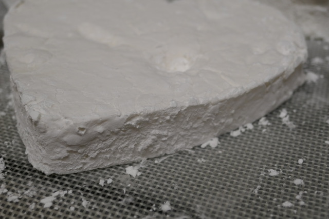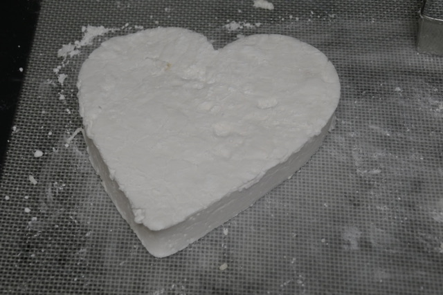 1. Avec un couteau (pour faire desserrer les bords) et une spatule, retirer le bloc de guimauve du plat. Avec une emporte-piece, découper des cœurs. J’ai deux tailles ; j’en ai coupé 5. Tremper les bords dans le mélange de poudres — croyez-moi, c’est important.