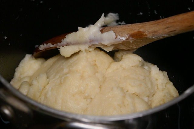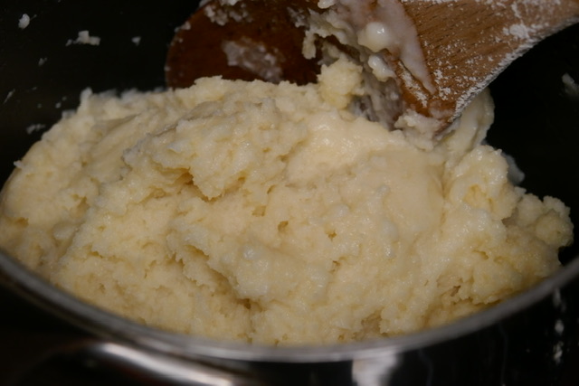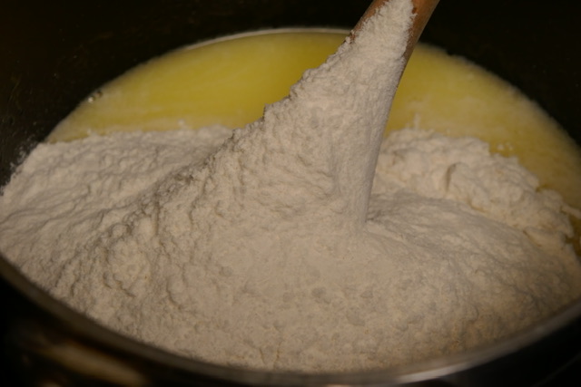 - Retirer la casserole du feu et ajouter toute la farine à une seule fois. Remuer avec une cuillère en bois jusqu’à ce que la pâte se ramasse complètement et ne colle plus aux bords. Baisser le feu, y retourner la casserole. Faire cuire pendant 1 minute de plus pour bien sécher la pâte.
