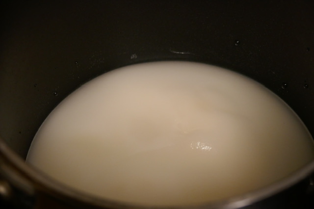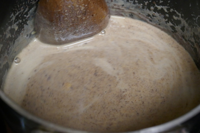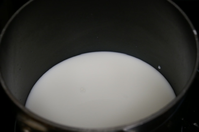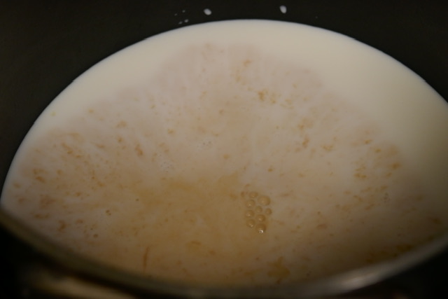 - Gratter les graines d’une gousse de vanille et les ajouter à 500 g de lait et faire chauffer sans bouillir. On peut également utiliser 1 cuillère à soupe de vanille liquide, ce que je fais.