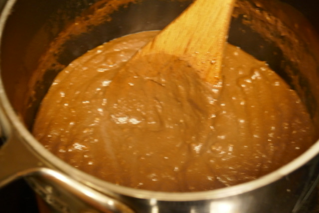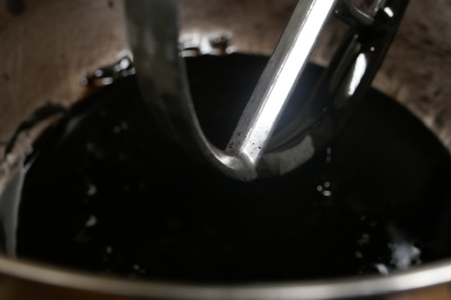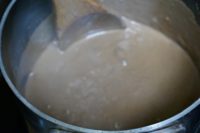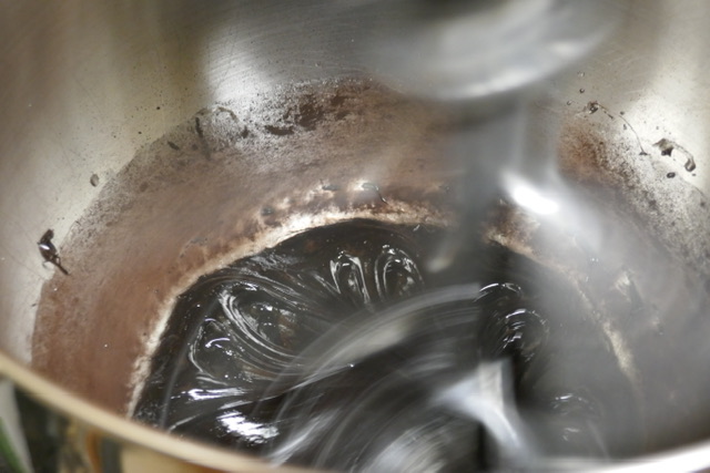 On passe au fondant au chocolat. Dans le passé, j’ai utilisé un peu de glucose, non pas seulement du sucre. Ce n’est plus le cas, car le glucose ne dissout pas aussi facilement.
