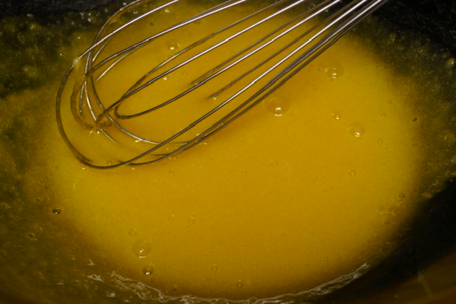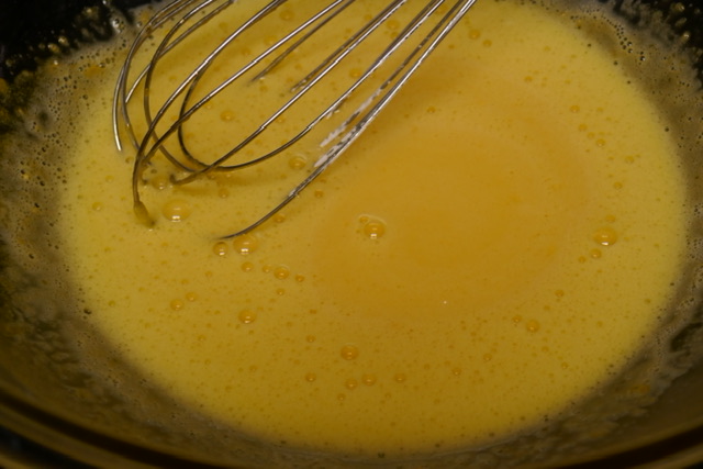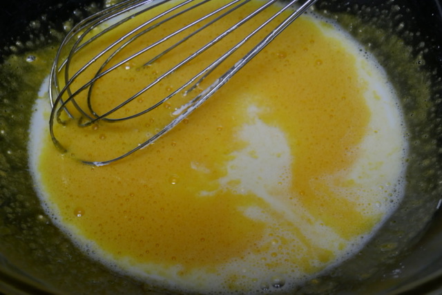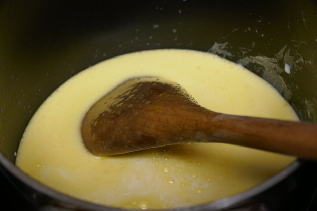 - Ajouter un tiers du lait chaud aux œufs pour éviter le choc thermique. Verser les œufs dans la casserole avec le reste du lait et fouetter.
