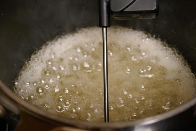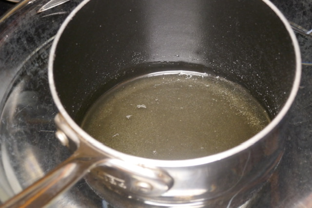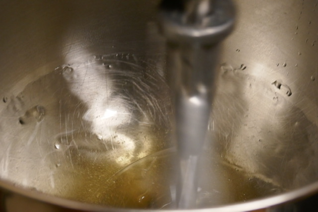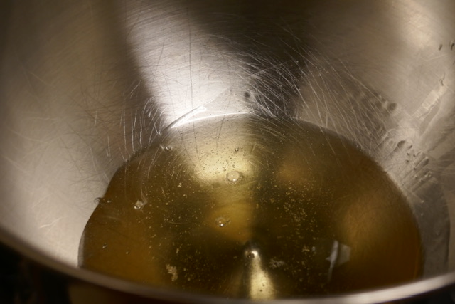 - Mettre le sucre et l’eau dans une casserole. Porter à ébullition à 114°C.