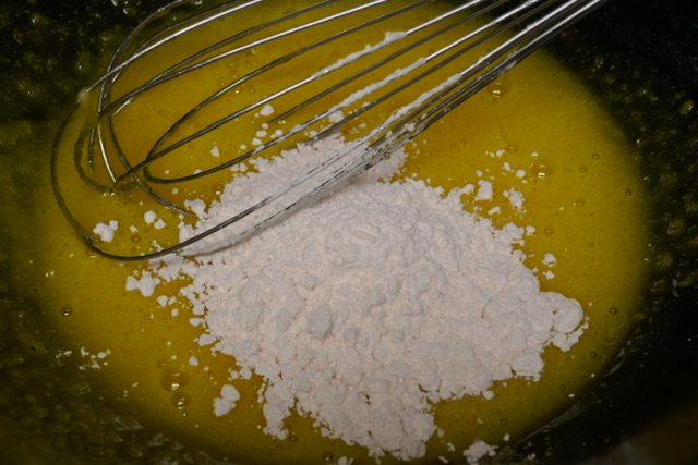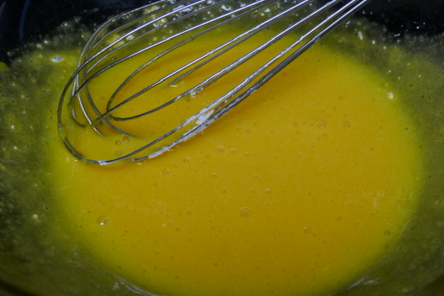 - Dans un saladier mélanger le sucre et les jaunes d’oeufs jusqu’à ce que le mélange blanchisse. Une fois le résultat obtenu on va pouvoir y ajouter 60 grammes de poudre à crème (ou maïzena). J’utilise Bird’s Custard Powder pour la poudre à crème.