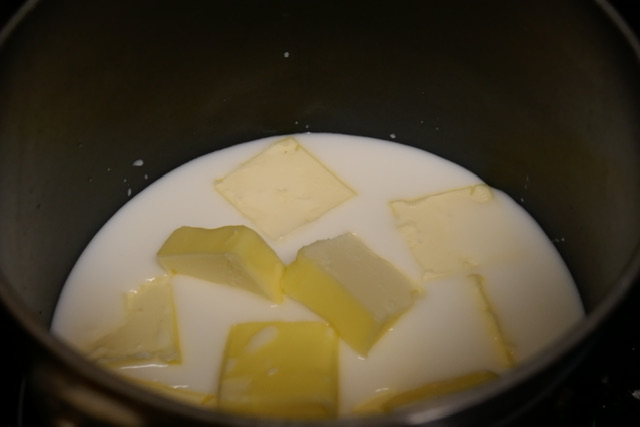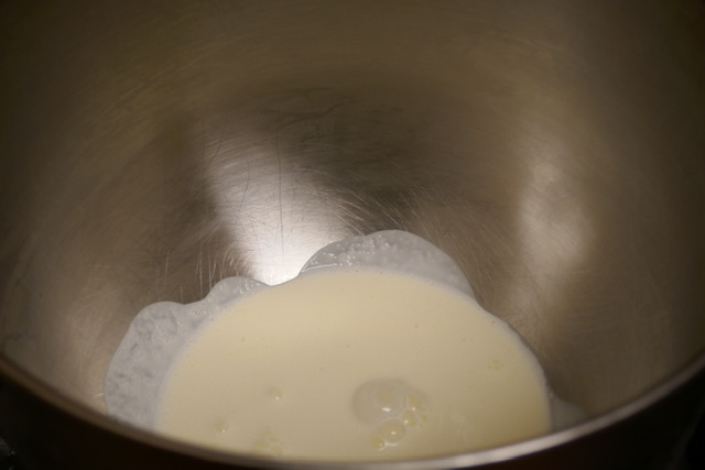 - Dans une casserole, mettre l’eau, le lait, le sel, le sucre, et le beurre. Faire chauffer jusqu’au point de bouillir (de vapeur et de premières bulles).
