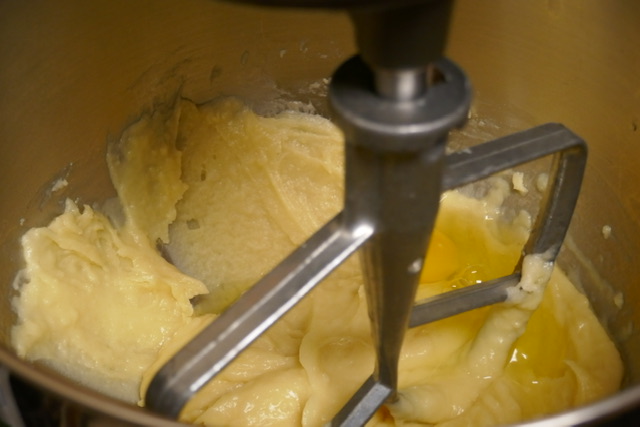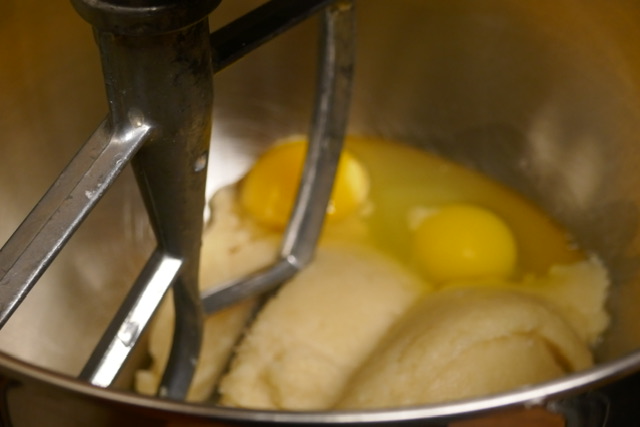 - Transférer la pâte au bol d’un robot avec la feuille. Ajouter 2 œufs et mélanger bien. Répéter. Si la pâte est lisse et sans grumeaux, on est prêt. Sinon, ajouter un œuf de plus et mélanger, mais 5 œufs est la limite. J’ai utilisé 4 œufs.