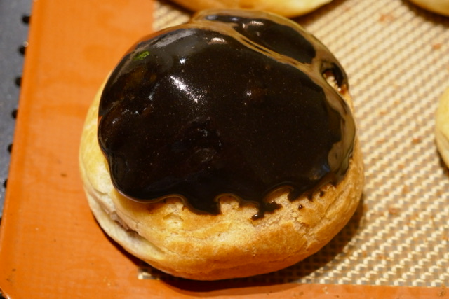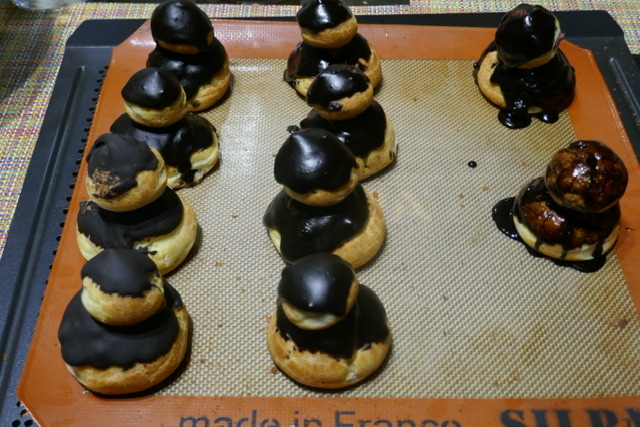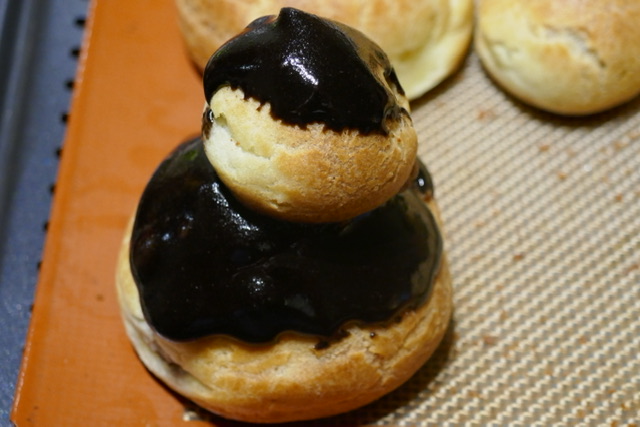 On continue le montage. Il est fort probable que vous alliez avoir besoin d’ajouter un peu d’eau au fondant. Faites attention — il ne devrait pas couler. Tremper chaque chou dans le fondant, et poser les petits sur les grands. Les deux en bas à gauche ne sont pas assez brillantes car j’ai pas utilisé assez d’eau. Mais le dernier chou, en bas à droite, a reçu trop d’eau, et son fondant était trop humide en résultat.