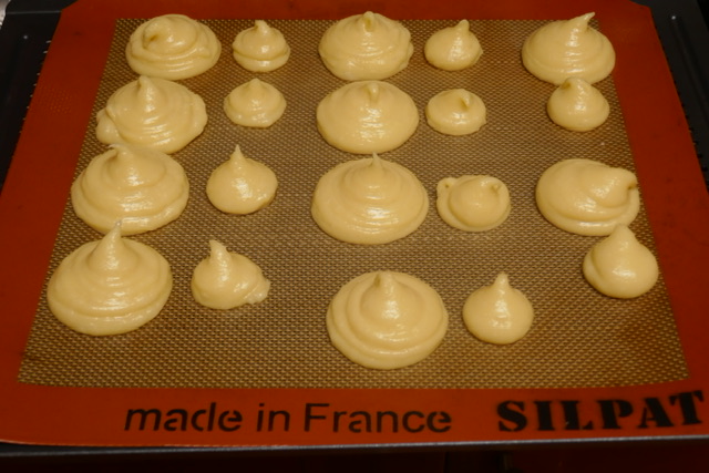 - Avec une poche à douille et une douille de 1 cm, faire des choux par paires, un petit avec chaque gros.