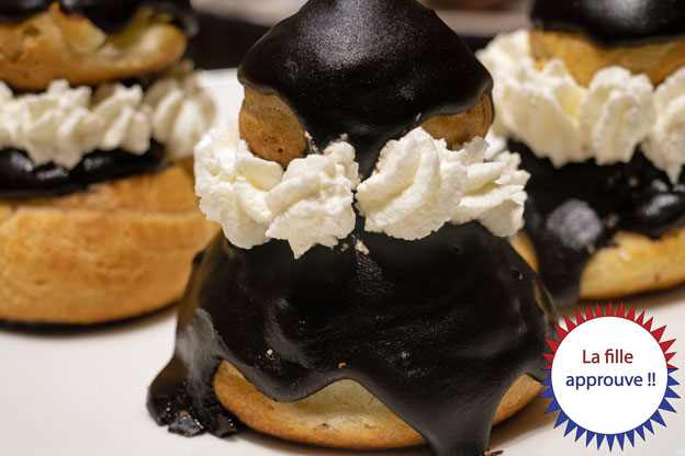 L’une de mes envies la plus anciennes vient de l’été magique où j’ai découvert Cook&Record et regardé une belle cinquantaine de ses vidéos. Je n’avais jamais entendu parler du dessert appelé « religieuse », mais sa vidéo m’a donné envie. Alors quand ma fille l’a récemment vue, et m’a demandé de les faire, c’était très, très facile de me convaincre. J’ai fait une excuse qu’elle a dû d’abord réussir un examen, mais j’ai déjà su qu’elle gagnerait une bonne note. Elle l’a fait, alors voilà :