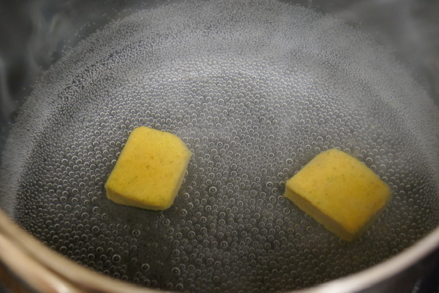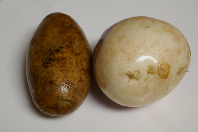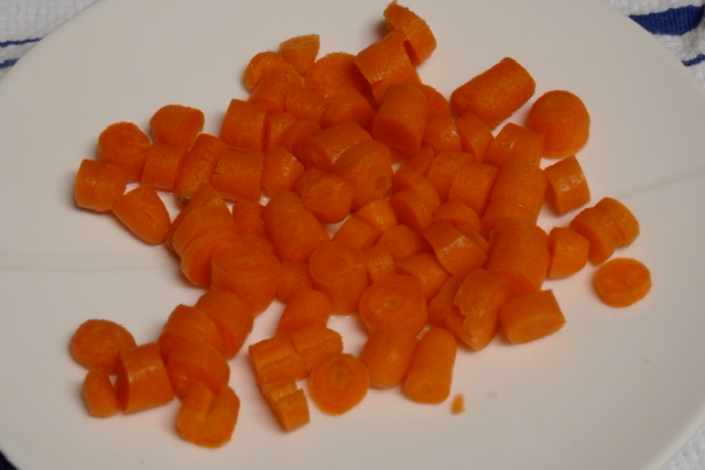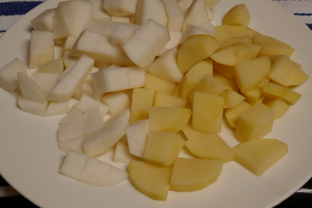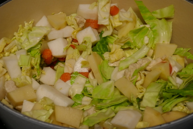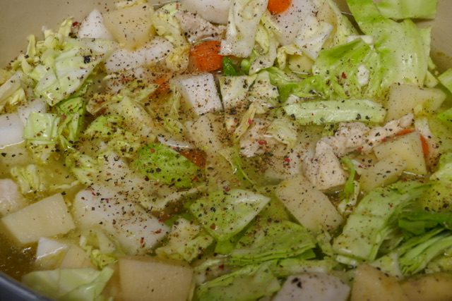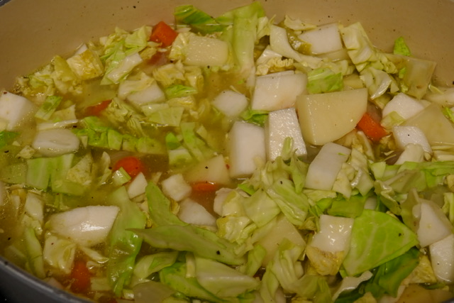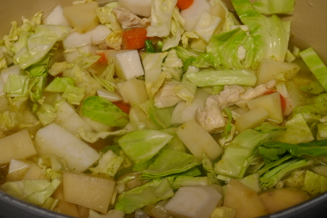 - Pendant que le poulet et les légumes mijotent, couper la pomme de terre, le navet, le chou, et les carottes.