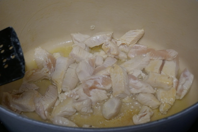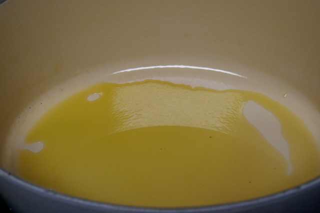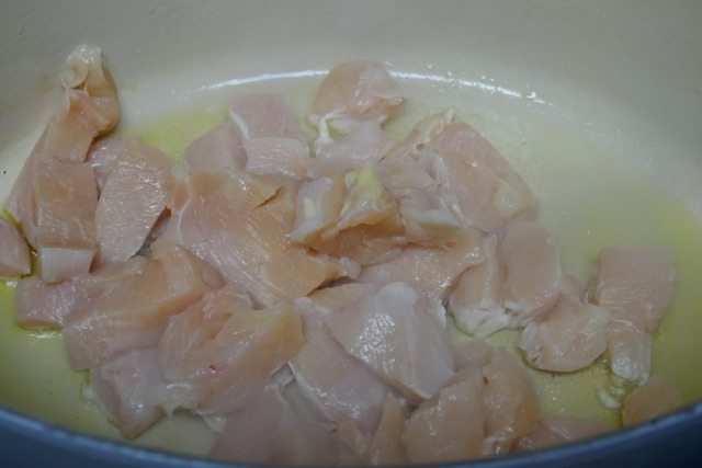 - Mettre de l’huile d’olive dans une cocotte (la mienne fait 6,75 L), juste assez pour couvrir le fond. Chauffer l’huile sur un feu moyen, puis y faire revenir — légèrement — le poulet.