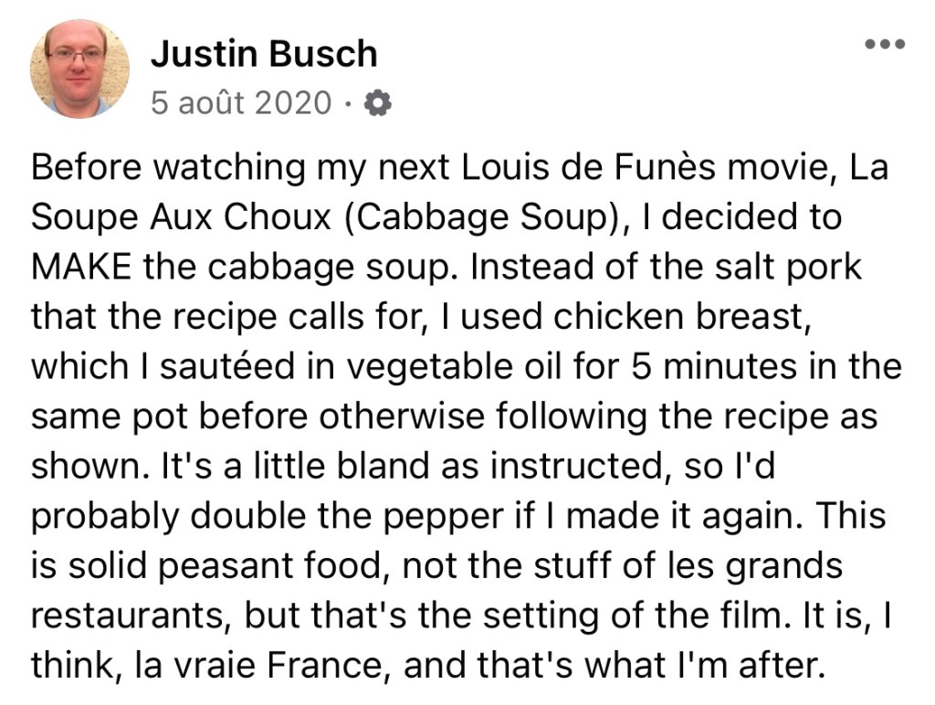 Il n’y a pas trop à ajouter. On ne trouve pas cette soupe dans les bistrots américains, alors je ne connaissais pas cette soupe jusqu’en 2020. Ce que j’ai écrit à mes amis anglophones à l’époque dit tout : « C’est la cuisine des paysans, pas des grands restaurants, mais c’est où le film a lieu. C’est, je pense, « la vraie France », et c’est ça dont je suis à la recherche. »