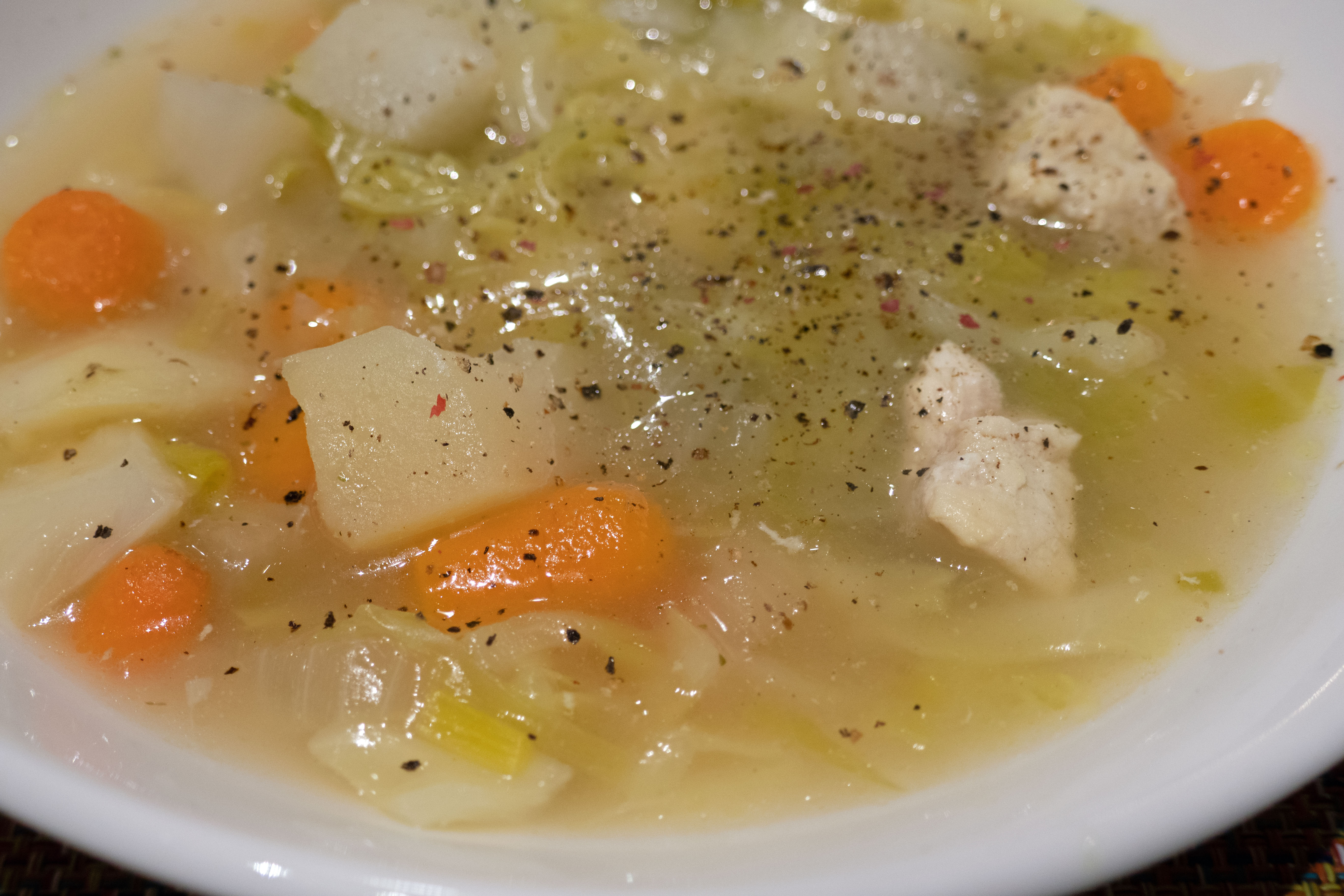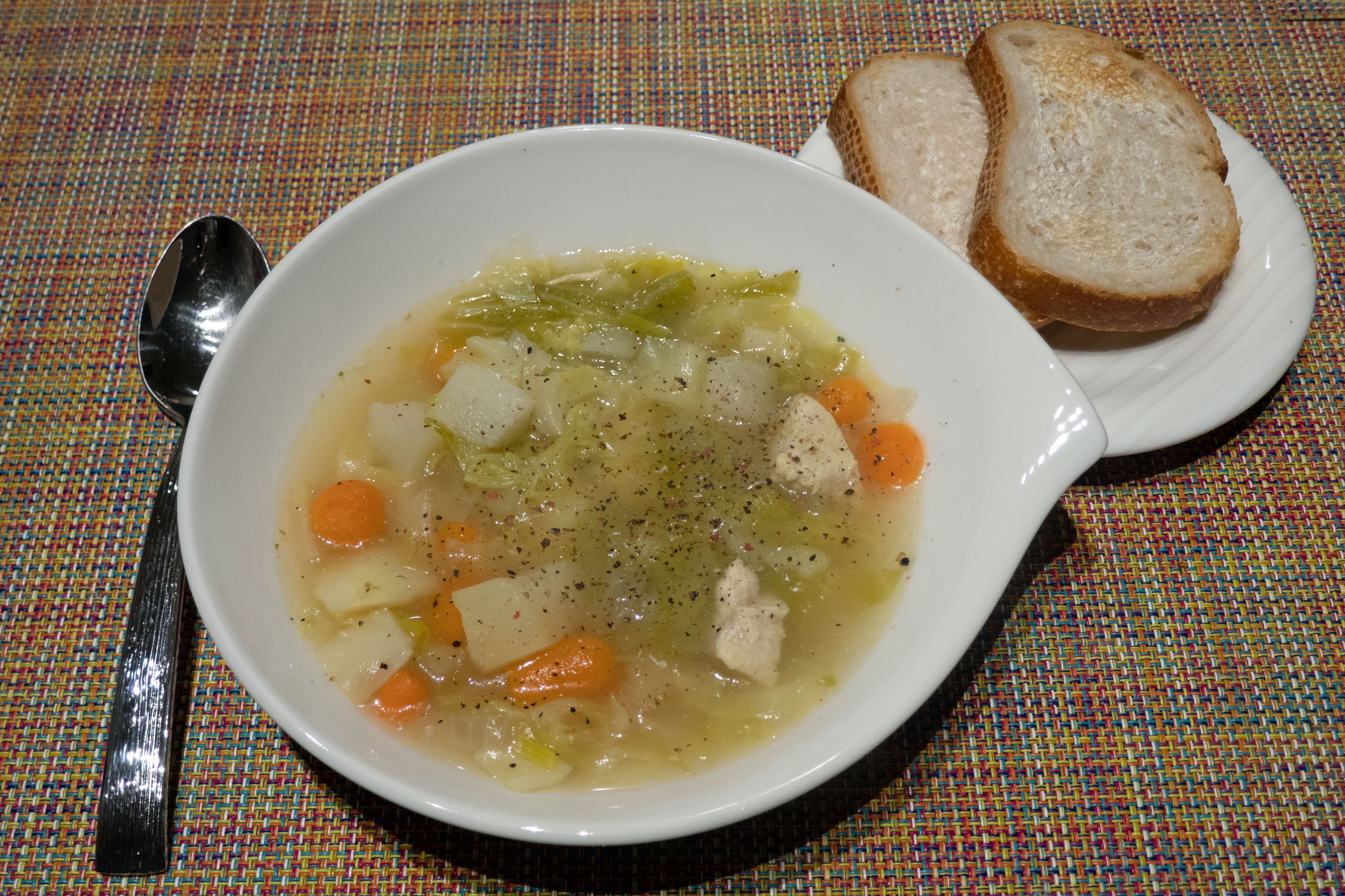Le seul changement, à part une pomme de terre de moins, c’est du poulet au lieu de lard ou poitrine salée. Je l’ai déjà eu sous la main, et avec ça, cette recette est un très bon marché, 12 € pour assez de soupe pour 4-6 personnes. (Il n’y a pas d’ingrédients de luxe comme un œuf ou de la crème fraîche.)