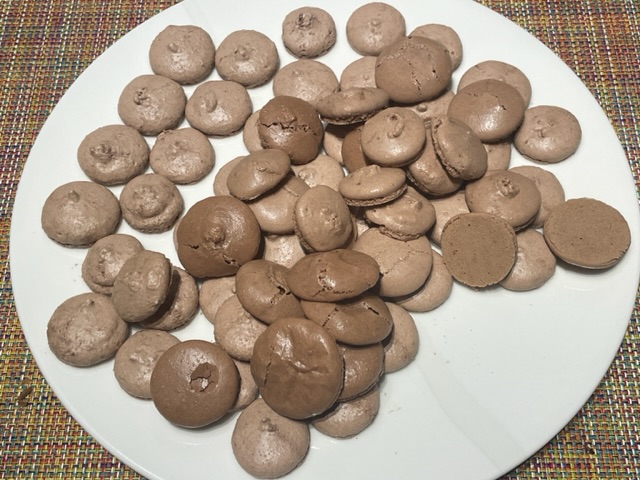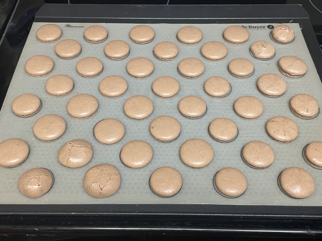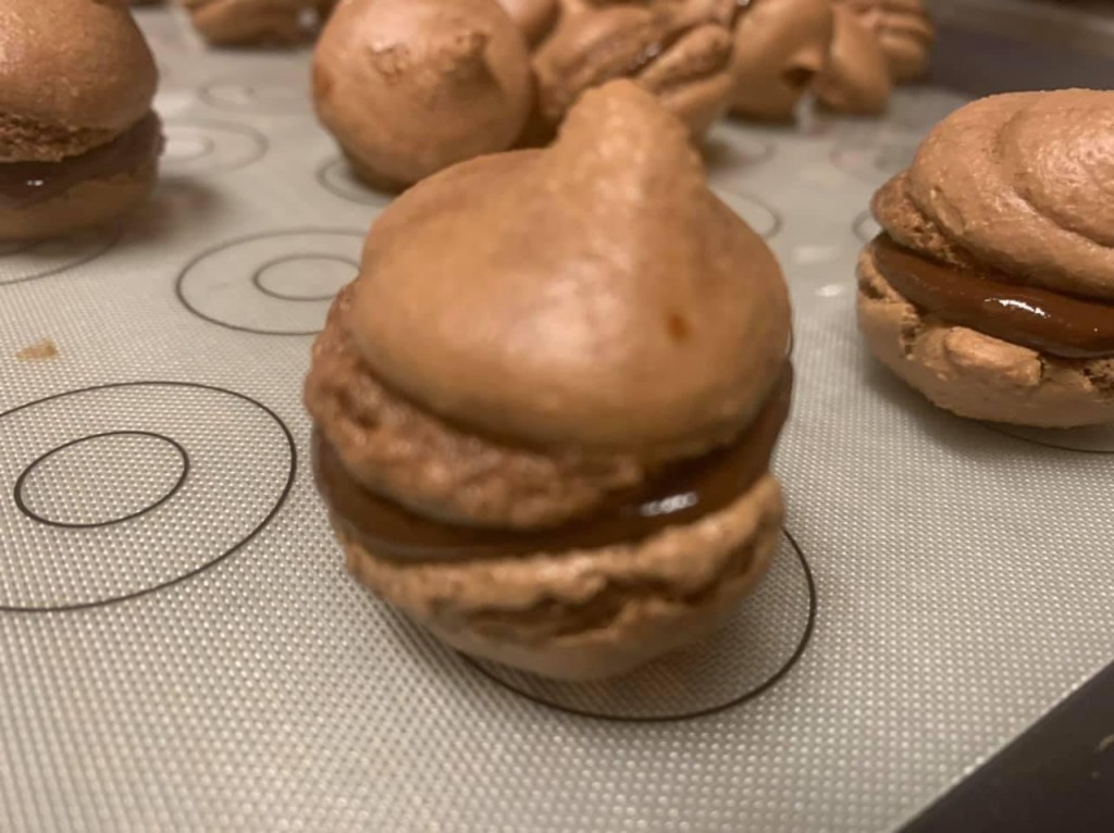 Pour une autre chose, cuisiner à la française, surtout pour une recette aussi technique que les macarons, ça demande de l’expérience. On ne se réveille pas un jour ensoleillé en disant « Je vais vendre des macarons ». Aimeriez-vous voir mon tout premier lot en 2020 ? Voilà :