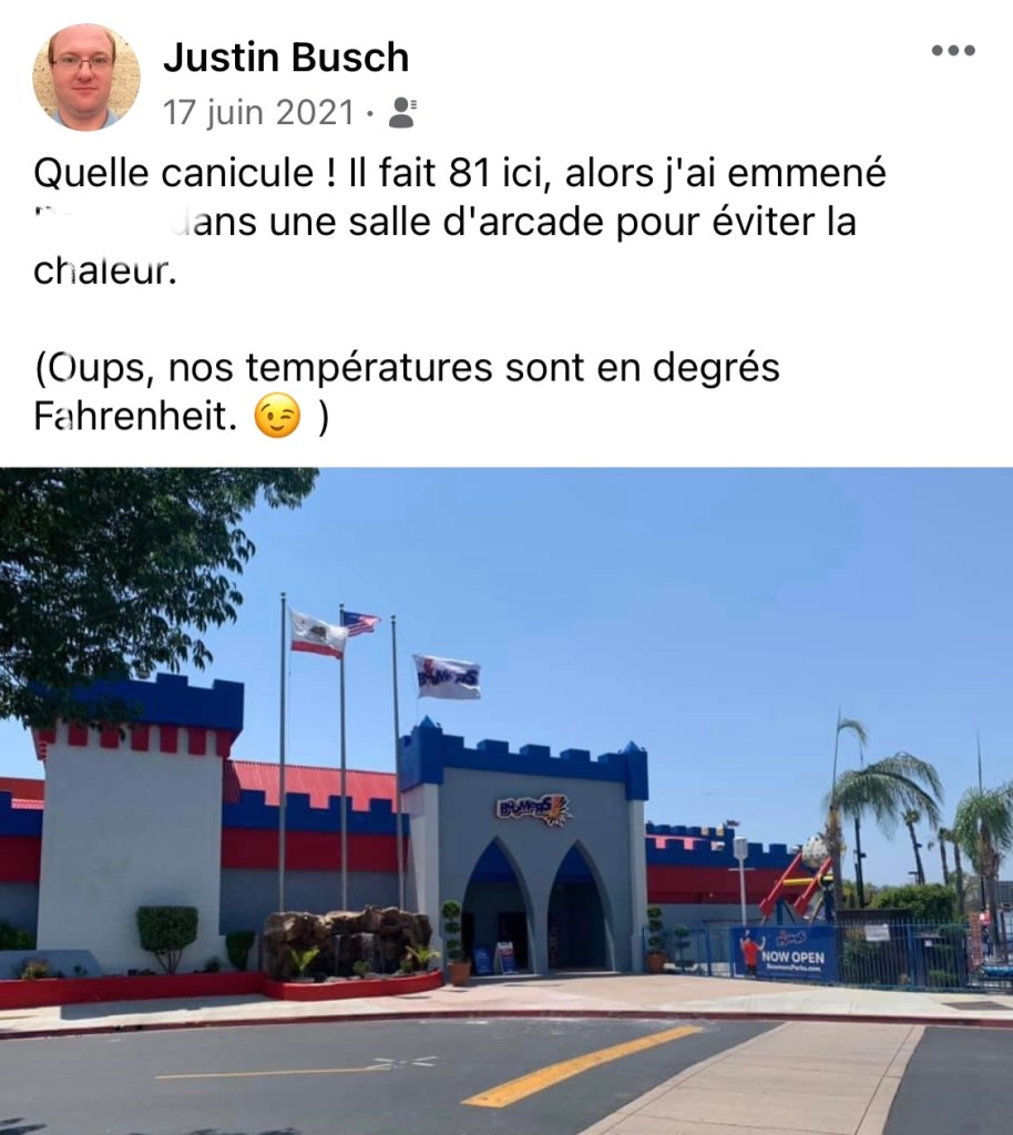Mais d’autre part, j’ai parfois l’impression d’être analysé par des extra-terrestres. Oui, on utilise le système Fahrenheit ici. S’il vous faut absolument connaître la météo en degrés Celsius, appuyez sur le bon bouton de votre portable. Ne vous plaignez pas que ce n’est pas logique après avoir déménagé ici. On a déjà eu ce combat pendant les années 60. À chaque fois où je veux partager la température chez moi avec mes amis européens, j’appuie sur DEUX boutons dans ma voiture. L’un est pour changer l’échelle. L’autre est pour mettre une chanson française à la radio pour leur faire croire que je n’écoute rien d’autre — j’ai une réputation à maintenir ! Voici un exemple :